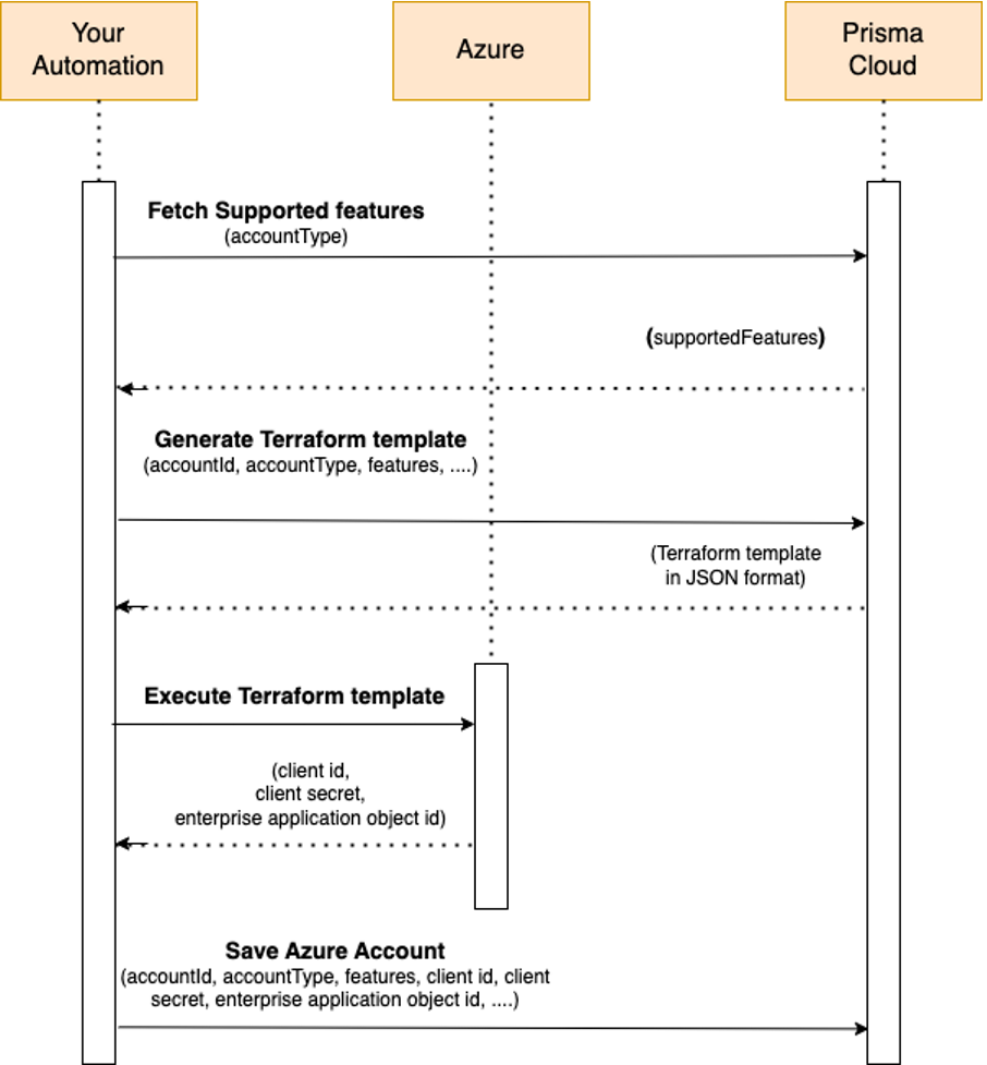 NOTE: By default, the supported features list contains Cloud Visibility Compliance and Governance. Do not include it as a feature in the supported feature request body parameter of any cloud APIs, such as Add Azure Cloud Account, Update Azure Cloud Account, Azure Template Generation and so on.